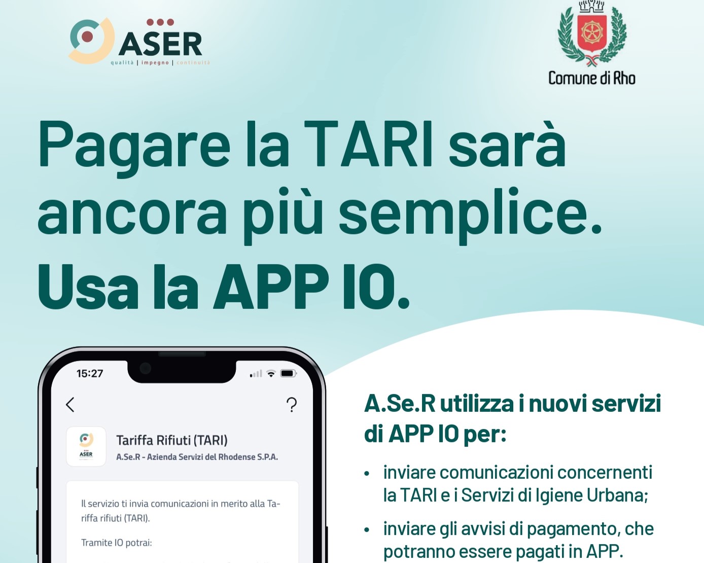 Da oggi, nell’area dedicata ai “Servizi” dell'AppIO, digitando “Rho” nella barra di ricerca Ente, troverai anche A.Se.R.