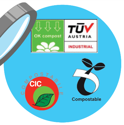 I materiali in bioplastica, per essere compostabili, devono essere sempre certificati secondo lo standard europeo UNI EN13432 e devono riportare almeno uno dei simboli appositi (vedi allegati) accompagnato dalla scritta “compostabile”.